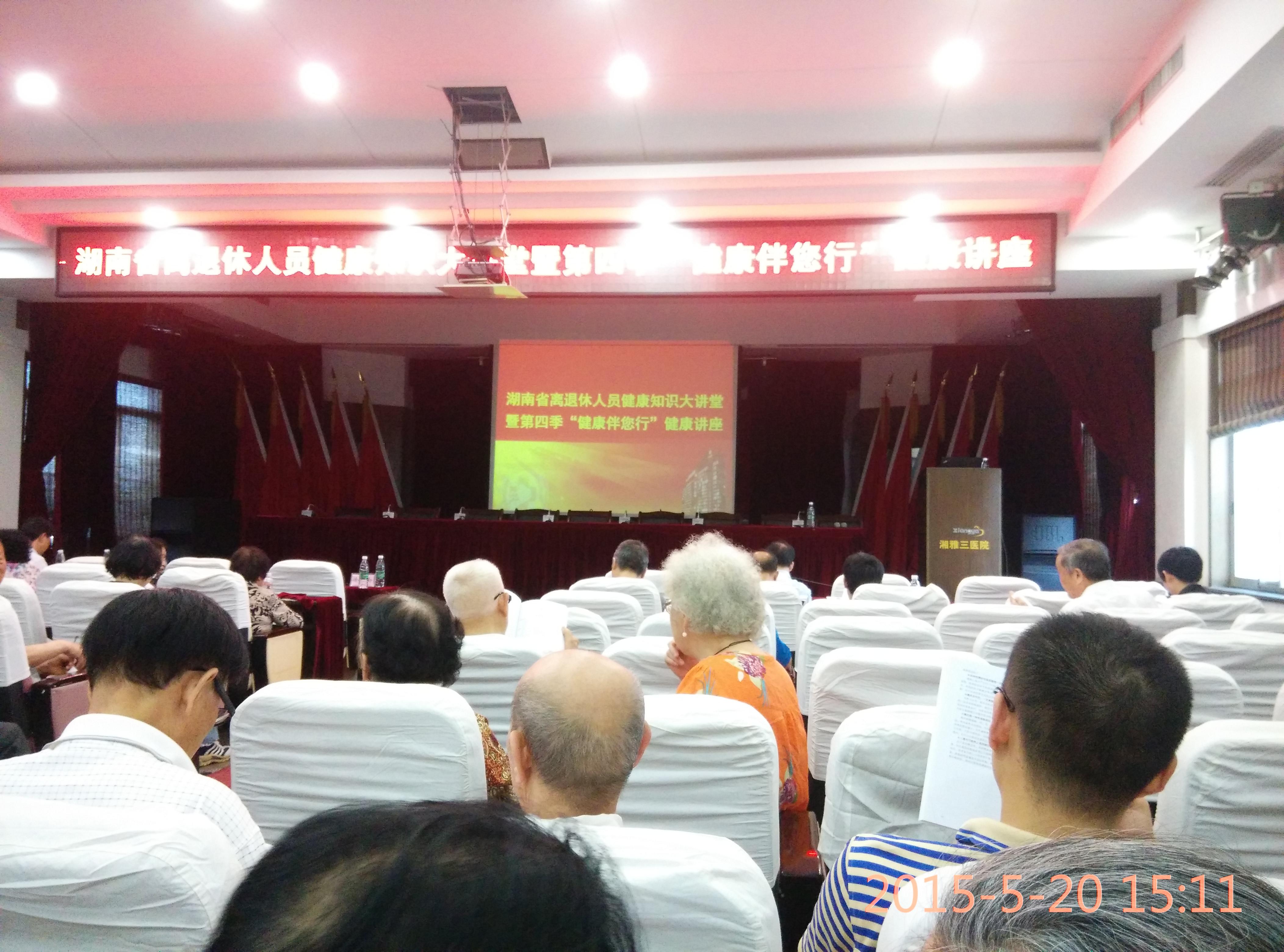 5月20日下午,湘雅三医院门诊楼五楼的多功能会议室高朋满座,由省委老干局组织的“健康知识大讲堂”系列健康知识讲座在此召开。我校10多位退休教职工参加了讲座。湘雅三医院副院长袁洪教授就慢性非传染性疾病的预防及自我管理工作等内容进行了详细的阐述。老同志们纷纷表示袁教授讲得好,收获大,对疾病的预防及自我管理有了深刻的认识,对健康的生活方式有了明确的方向。